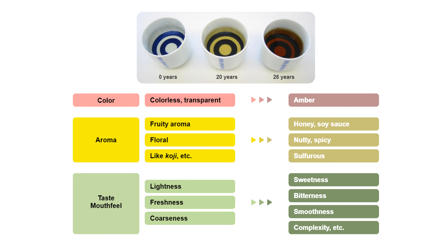 At the other end, storage at room temperature allows Maillard-type reactions to proceed more quickly, producing more pronounced colour development, caramel and soy sauce-like character, and stronger tertiary aromas in a shorter time. A note worth making here for international readers: “room temperature” in Japan should not be imagined as a stable, mild condition year-round.