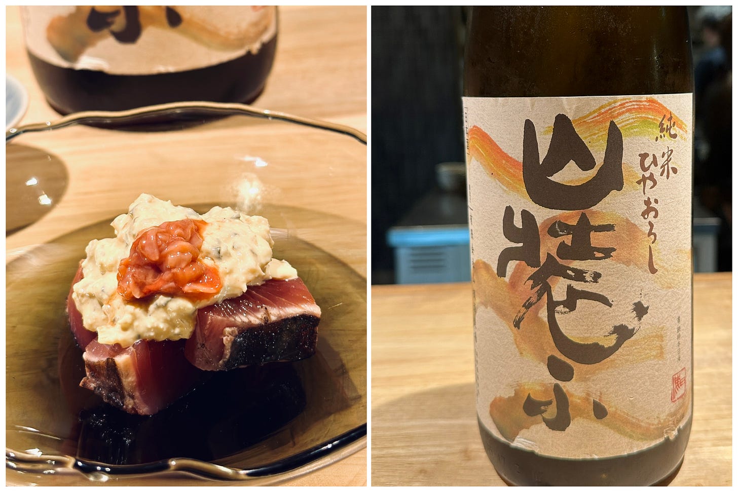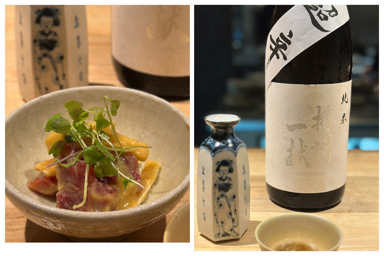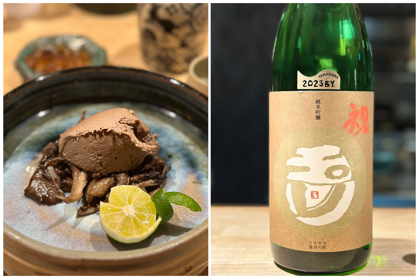 The sake: Tamagawa “Iwai” Junmai Ginjo, 2023BY. Tamagawa is made in Kyoto by British toji Philip Harper (more on him in my previous article). “Iwai” means celebration—it’s also the name of a Kyoto-grown rice variety used here. The result is round and generous, with just enough acidity to stay balanced.